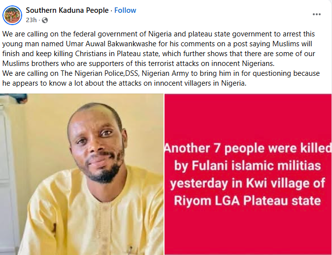 “We are calling on the federal government of Nigeria and plateau state government to arrest this young man named Umar Auwal Bakwankwashe for his comments on a post saying Muslims will finish and keep k!lling Christians in Plateau state, which further shows that there are some of our Muslims brothers who are supporters of this terrorist attacks on innocent Nigerians. We are calling on The Nigerian Police, DSS, Nigerian Army to bring him in for questioning because he appears to know a lot about the attacks on innocent villagers in Nigeria,” a post on Southern Kaduna People reads.