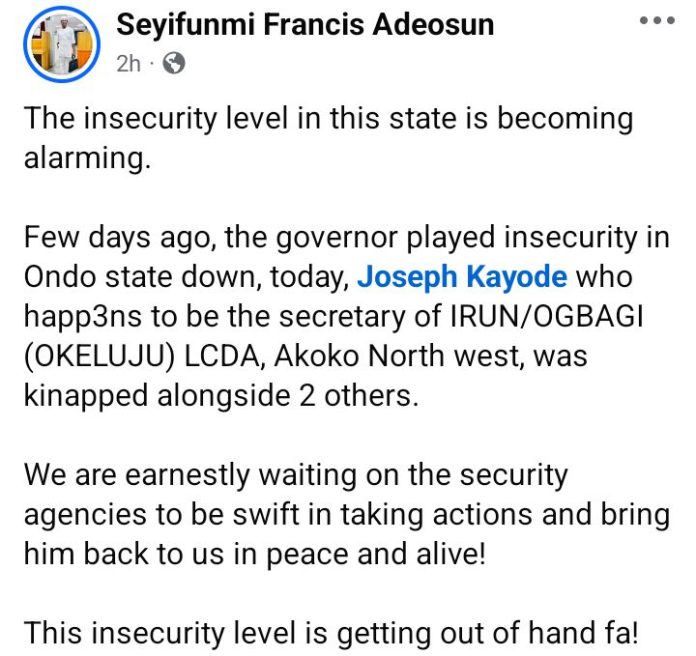 The News Agency of Nigeria reports that Kayode is the Secretary of Okeluju Local Council Development Area in Akoko North-West Local Government Area.