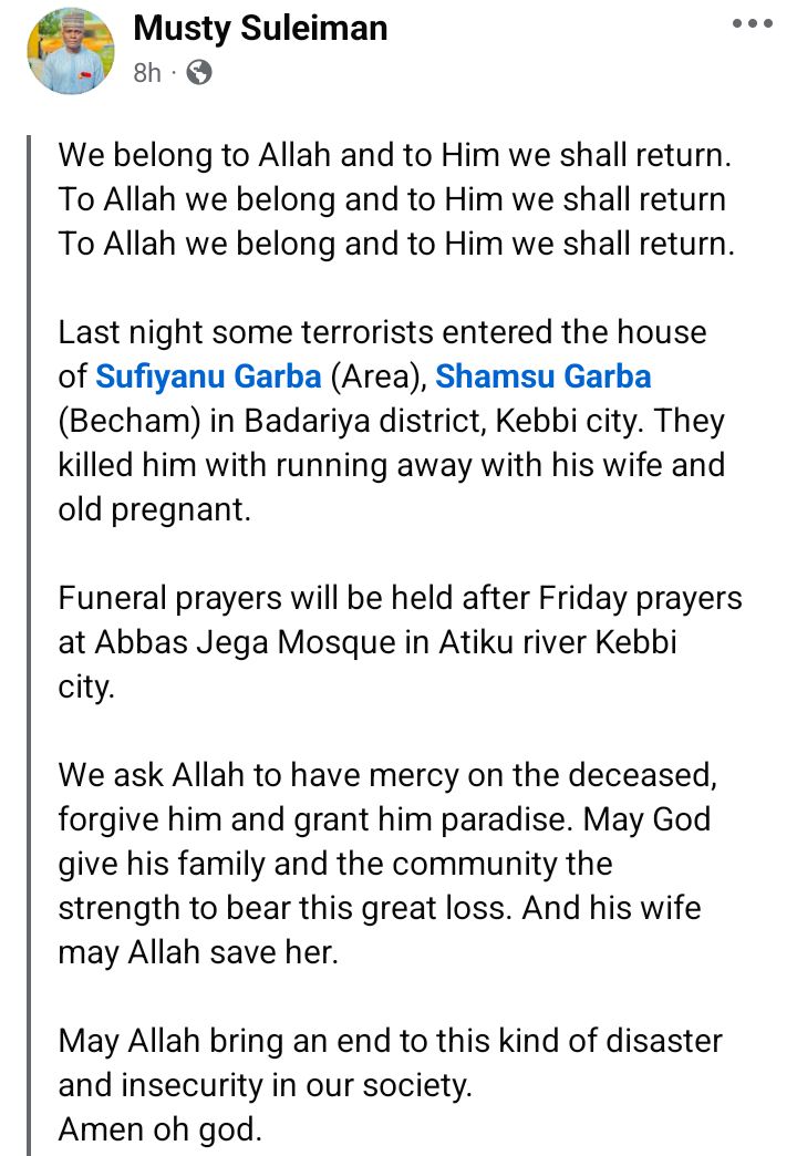 Gunmen have k!lled a 35-year-old man, Sufiyanu Garba, and abducted his wife during an attack in Badariya area of Birnin Kebbi, Kebbi State.