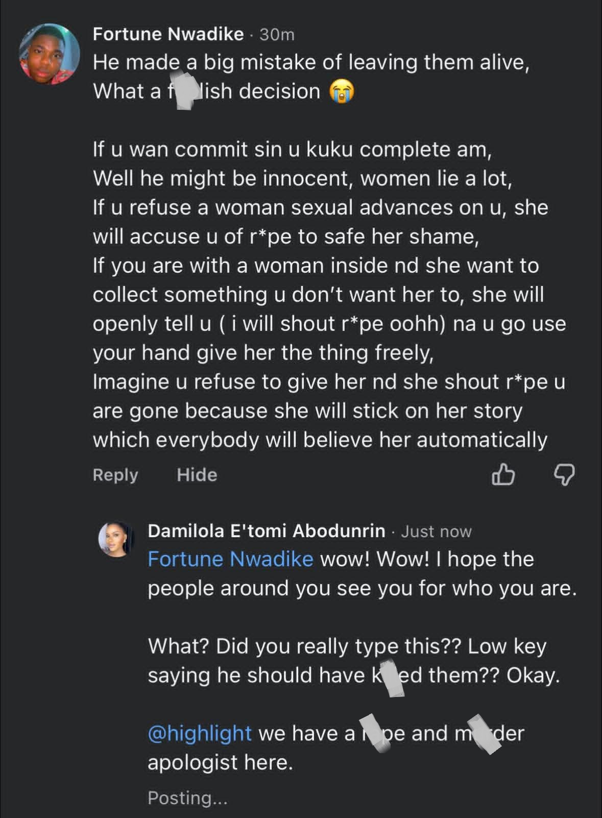 The comment from Fortune Nwadike sparked outrage and he quickly deactivated his Facebook account.