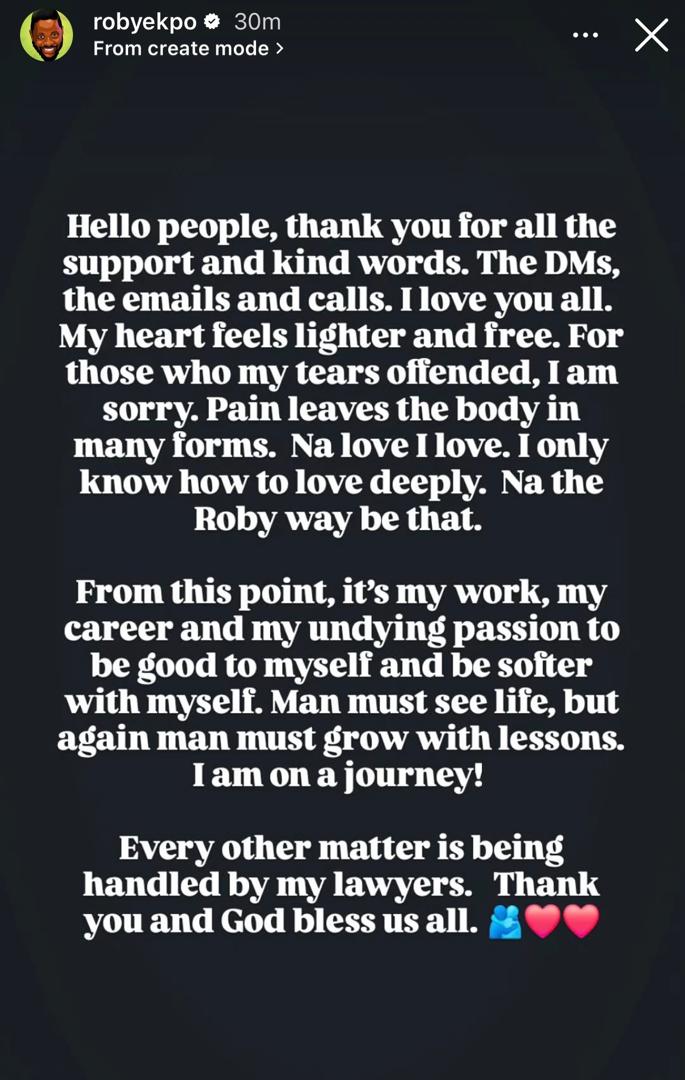 In a post shared on IG this evening, Roby siad pain leaves the body in so many ways, weeping inclusive.He mentioned that he only loved a person deeply which is the only way he knows how to love. He stated that going forward, he will not be speaking about his failed marriage to Mayowa anymore.