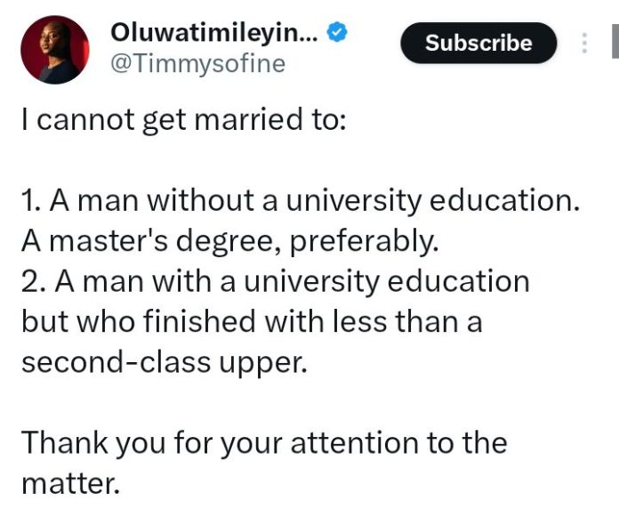 Oluwatimileyin, who stated this in a post on Sunday, said a man who finished with less than a second-class upper is also out of the question.