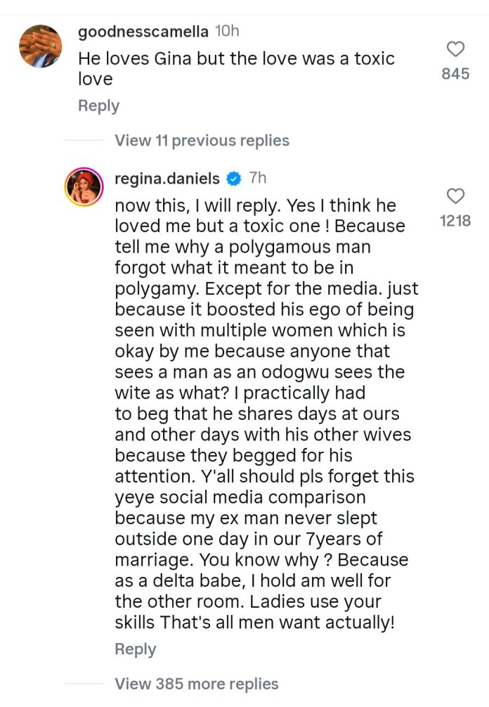 Regina Daniels has said that her estranged husband Ned Nwoko loved her to the point of toxicity and that he went as far as ignoring his other wives because of her.Â