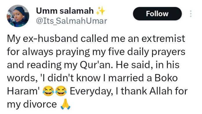 A Nigerian Muslim lady, Salmah Umar, has thanked Allah for her divorce as she recalled when her ex-husband called her extremist for praying five times a day and always reading the Quran.