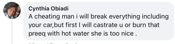 Commenting on a Facebook post about the man who allegedly impregnated his wife’s maid, she wrote; “A cheating man, I will break everything, including your car, but first I will castrate you or burn that preeq with hot water. She is too nice.”
