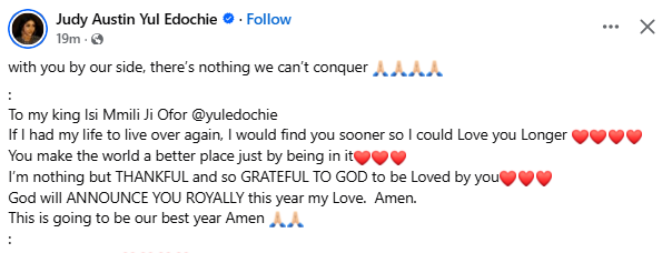 Actress, Judy Austin, has taken to social media to profess her love for her hubby, Yul Edochie.