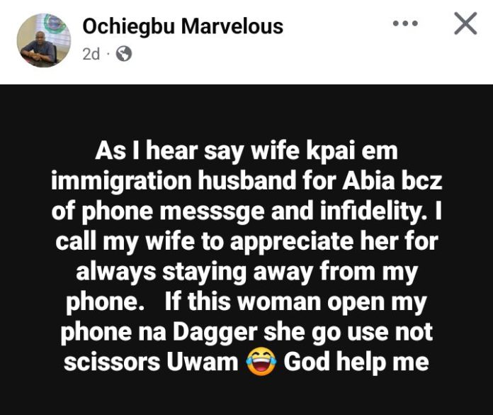 “As I hear say wife kpai em immigration husband for Abia bcz of phone message and infidelity. I call my wife to appreciate her for always staying away from my phone,” he wrote.