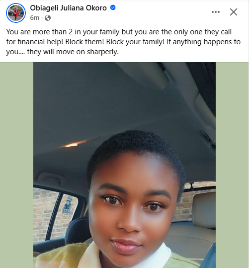 “You are more than 2 in your family but you are the only one they call for financial help! Block them! Block your family! If anything happens to you…. they will move on sharperly,” she added.