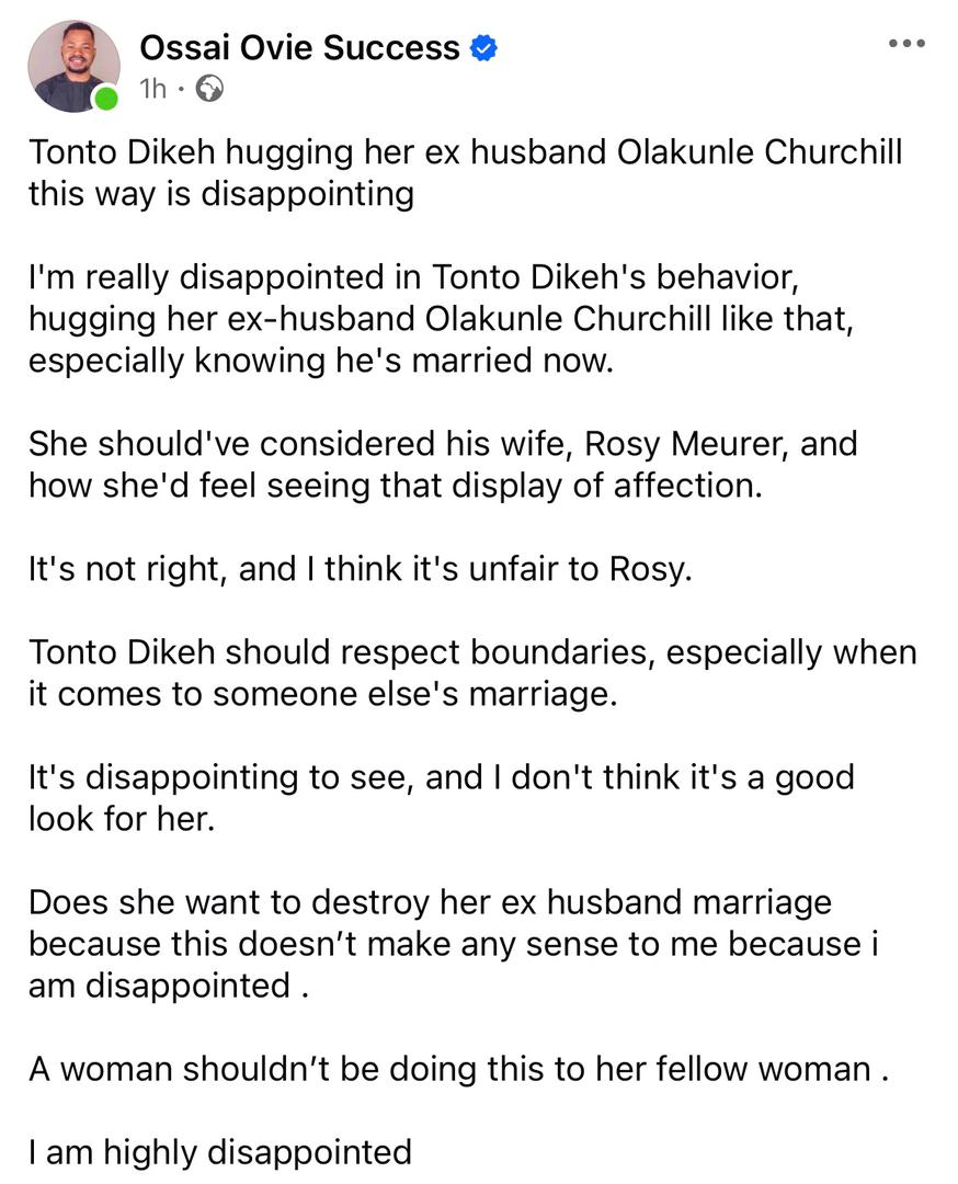 In a post shared on his Facebook page, Ossai said Tonto shouldn’t have hugged her ex-husband knowing that  he is a married man. He opined that she should have considered his wife, Rosy Meurer.