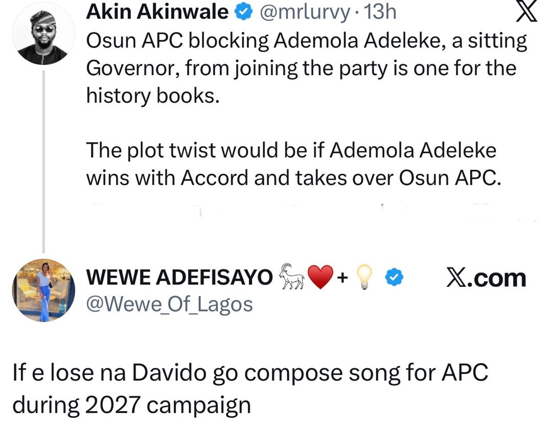 It all started when a troll mocked his Uncle, Governor Ademola Adeleke’s recent defection to Accord Party and suggested that if the governor gets defeated in the state governorship election scheduled to hold August 8, 2026, Davido will be forced to compose the APC campaign song for 2027.