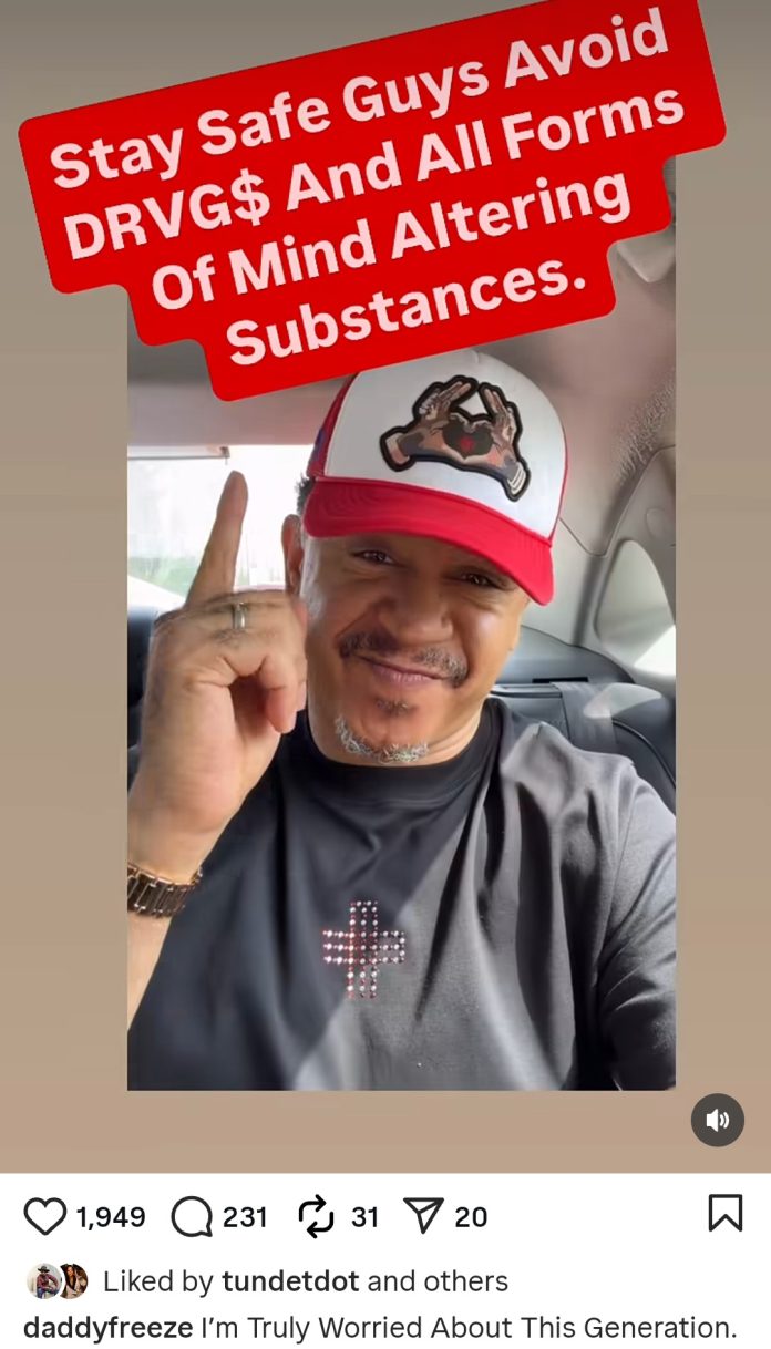 He wrote: “Stay safe guys. Avoid drvg$ and all forms of mind altering substances.”