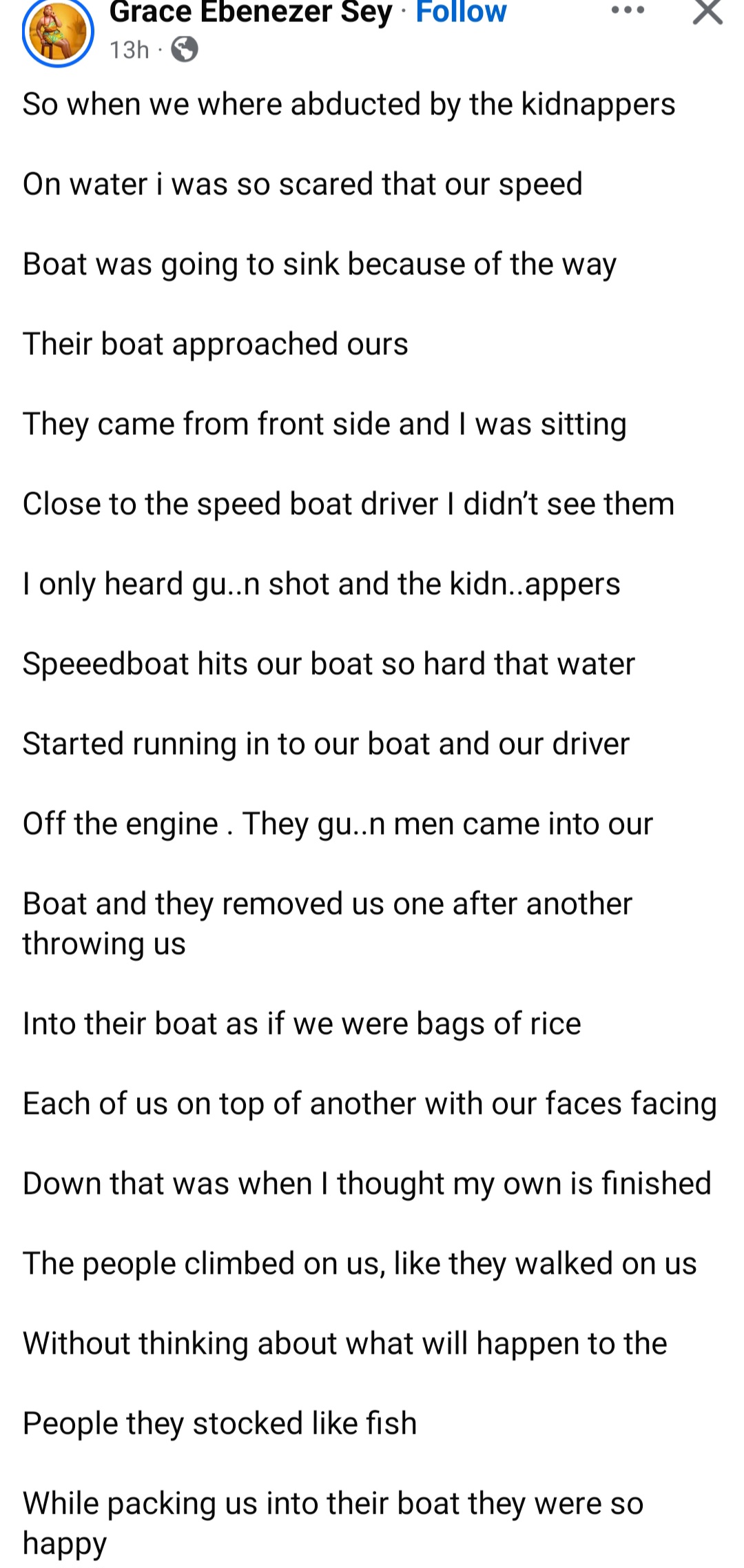 Grace Ebenezer Sey, a fashion designer, disclosed that she was travelling by boat when a speedboat approached their boat and blocked them off.