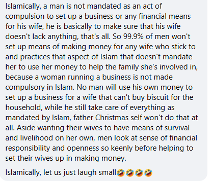 Reacting to her post, one Kasim Yusuf, said that in Islam, a married woman under her husband’s care and protection is not even allowed to do anything to make money, unless with his permission.