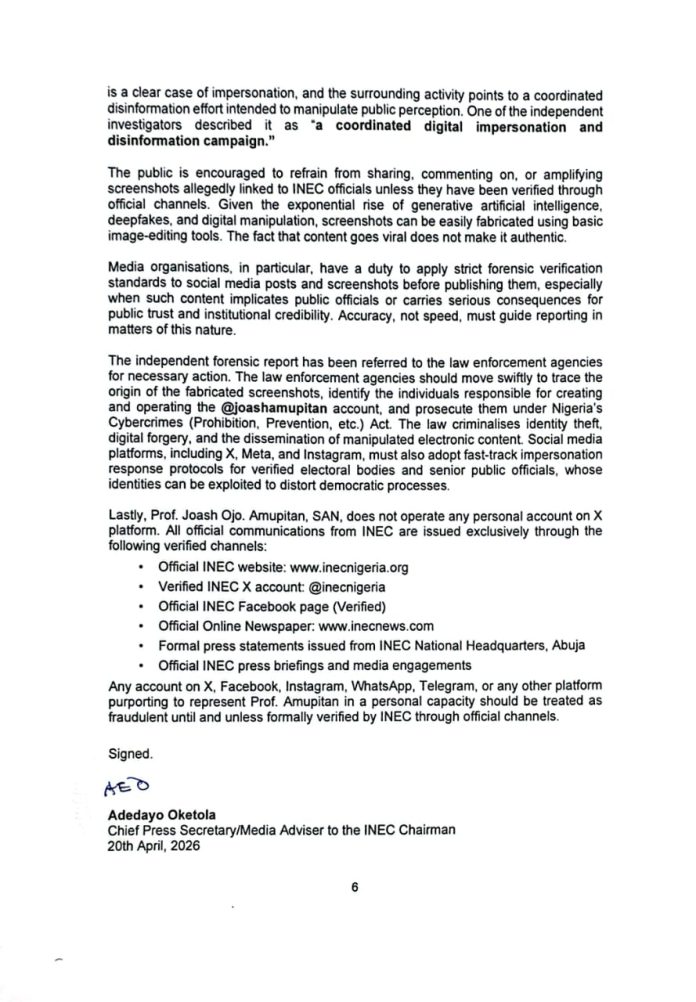 According to the commission, “the independent forensic investigation report conclusively establishes that Prof Amupitan does NOT operate any personal X (Twitter) account. All alleged posts, replies, or statements attributed to him on X (Twitter) are fraudulent, forensically unverifiable, technically impossible, and part of a coordinated disinformation.”