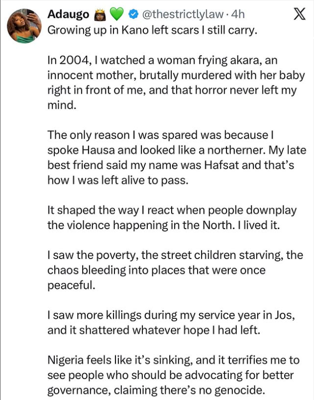 Adaugo also recalled seeing more violence years later during her national service in Jos, an experience she says shattered whatever hope she still held for peace.