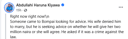 “A man has come to Bompai (Police headquarters) saying his wife refused to allow him to marry a second wife. He is inquiring whether it is legal to offer her N2 million to consent to the marriage. He was asking if it is against the law or not,” the police spokesman wrote.