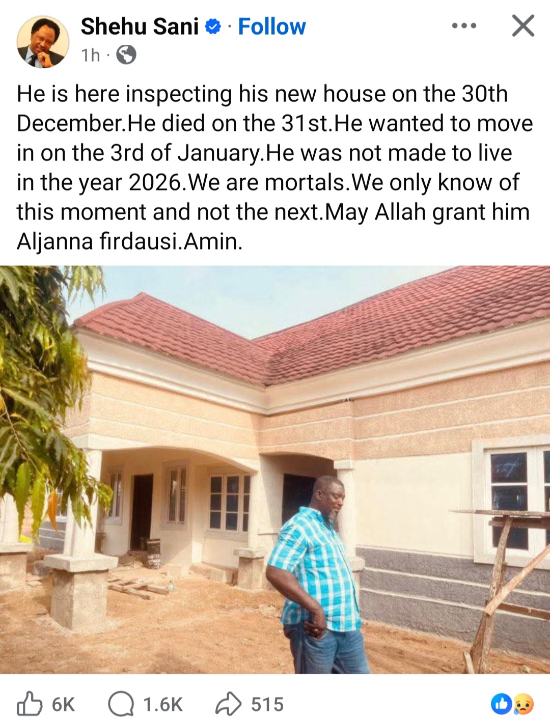 A man did just days before he was supposed to move into his newly built house. The man had gone to inspect the house on Dec. 30, 2025. He planned to move in on Jan. 3, 2026. Sadly, he did on Dec. 31, just one day after inspecting the house. Senator Shehu Sani shared a photo of the man inspecting the house just hours before his demise. He wrote: “He is here inspecting his new house on the 30th December. He did on the 31st. He wanted to move in on the 3rd of January. He was not made to live in the year 2026. “We are mortals. We only know of this moment and not the next. May Allah grant him Aljanna firdausi. Amin.”
