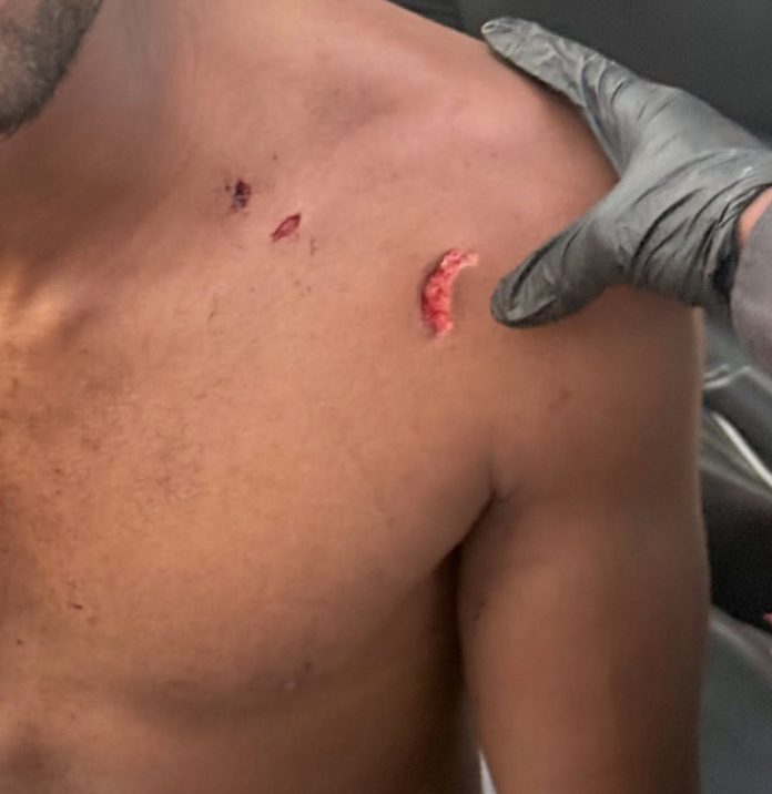 “Reaction Officers and RUSA Paramedics were dispatched to the scene, where they found the injured man seated in the passenger seat of an Opel Corsa bakkie. He was treated for three stab wounds to his chest,” the statement read.