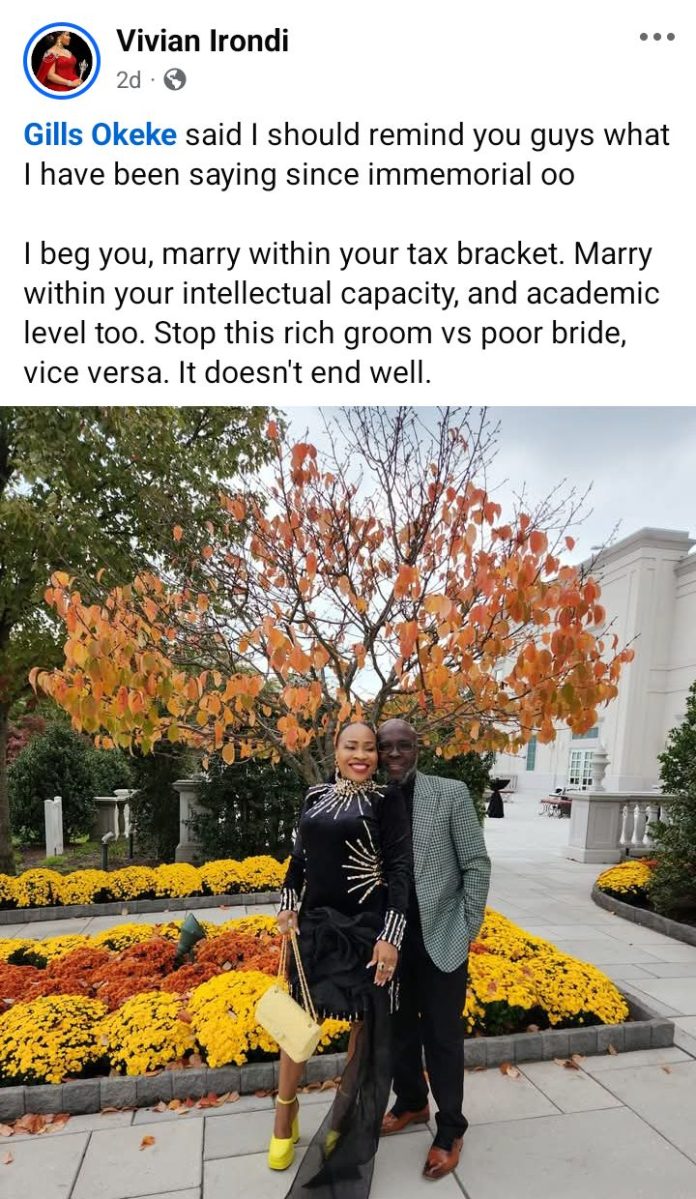 The philanthropist and mother of two, who gave the advice in a Facebook post said the ‘rich groom vs poor bride’ dynamic doesn’t end well.