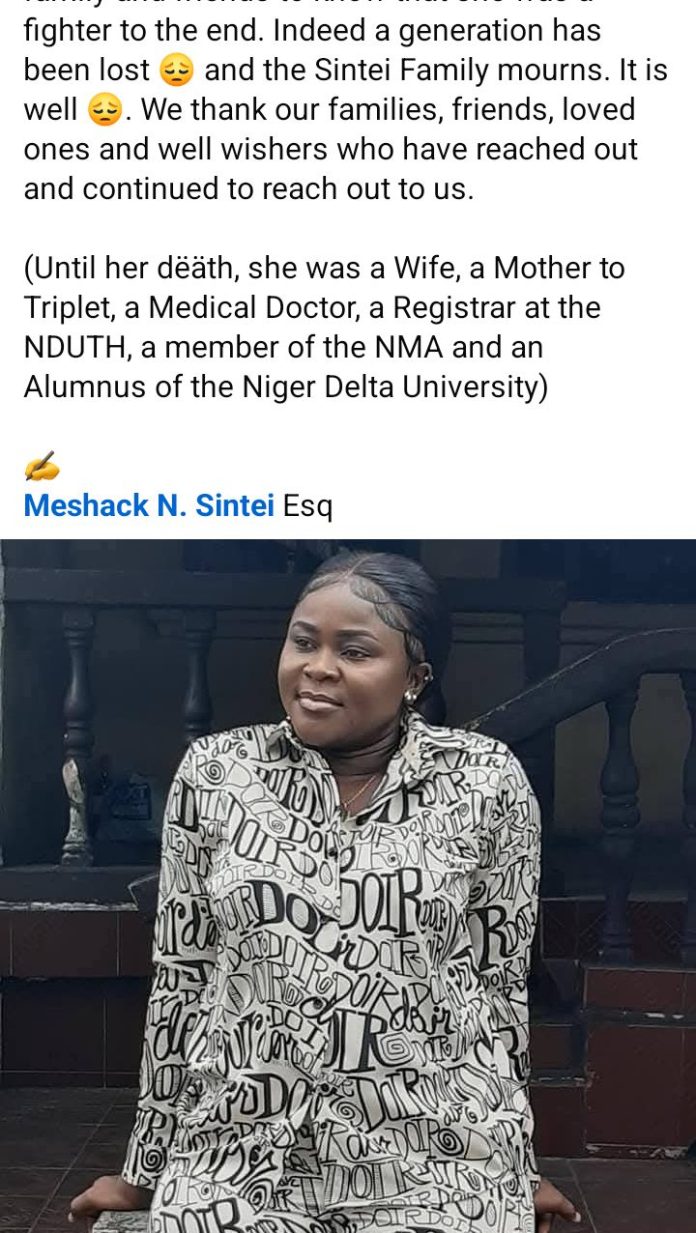 “(Until her dëäth, she was a Wife, a Mother to Triplet, a Medical Doctor, a Registrar at the NDUTH, a member of the NMA and an Alumnus of the Niger Delta University).”