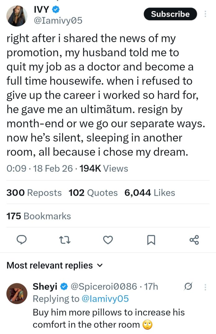 She wrote: “Right after i shared the news of my promotion, my husband told me to quit my job as a doctor and become a full time housewife. when i refused to give up the career i worked so hard for, he gave me an ultimãtum. resign by month-end or we go our separate ways. now he’s silent, sleeping in another room, all because i chose my dream.”