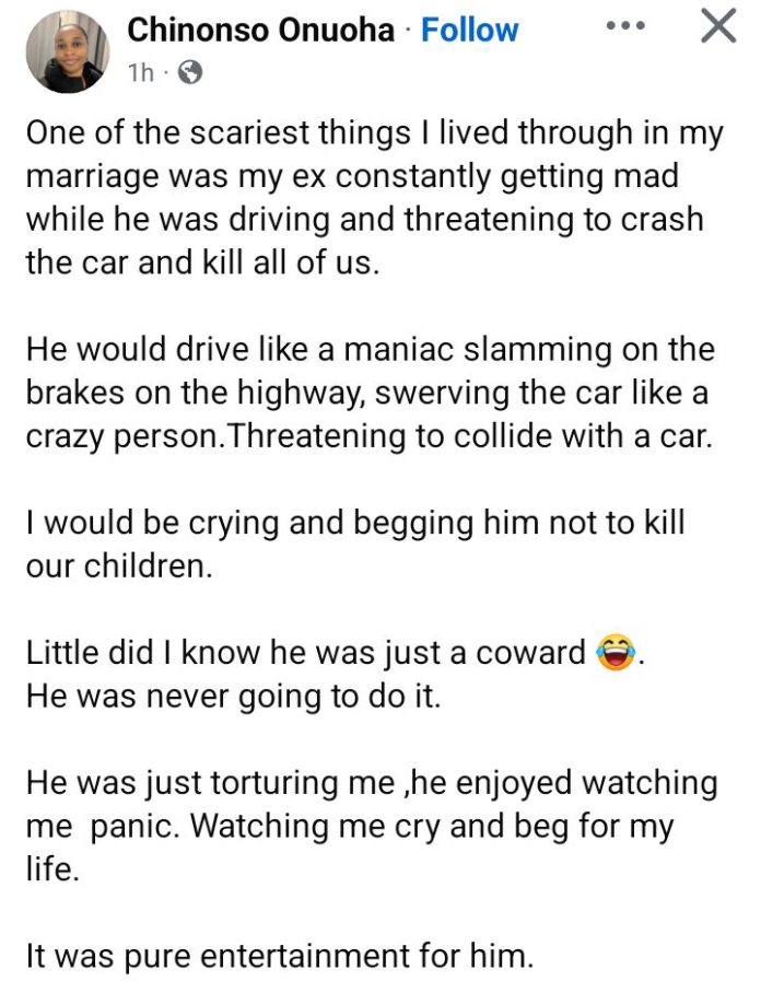 A Nigerian woman, Chinonso Onuoha, has revealed that one of the scariest experiences in her marriage was when her ex-husband would get angry while driving and threaten to crash the car and k!ll them, including their children.