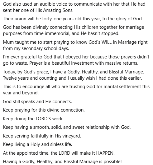 This is to encourage all who are trusting God for marital settlement this year and beyond.