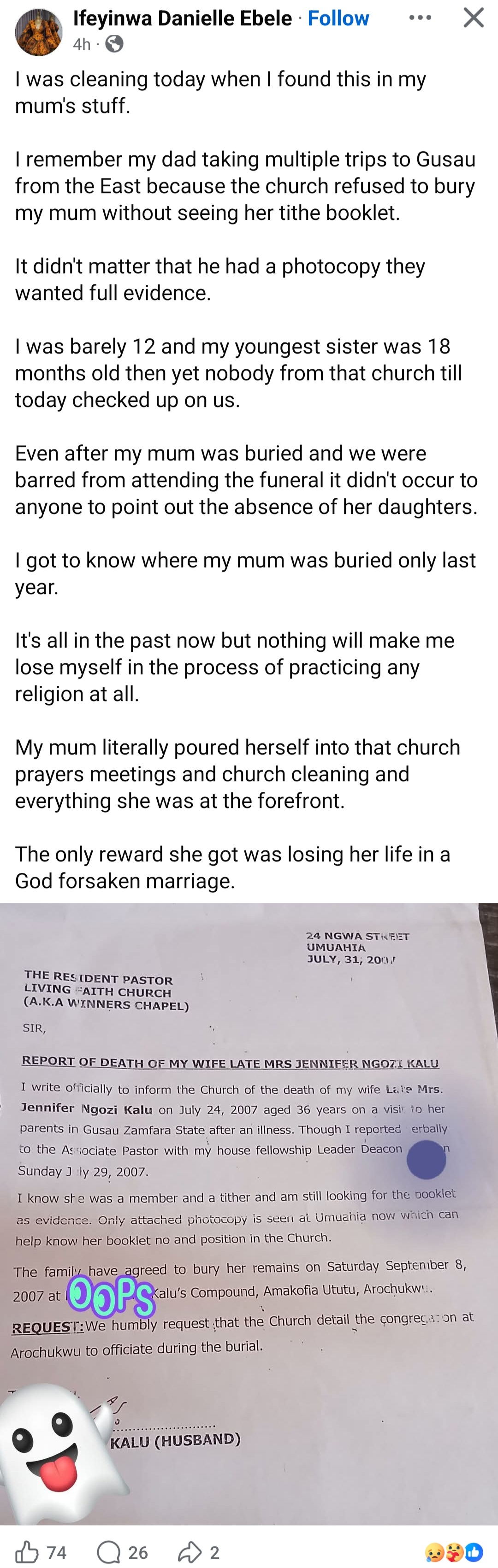 “My mum poured herself into church and the only reward she got was losing her life in a God forsaken marriage” Young woman writes as she reveals church’s apathy after losing mum