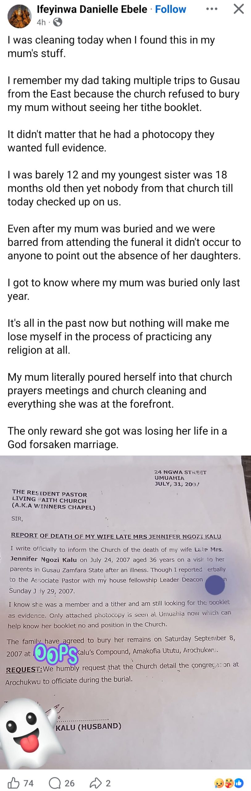 “My mum poured herself into church and the only reward she got was losing her life in a God forsaken marriage” Young woman writes as she reveals church’s apathy after losing mum