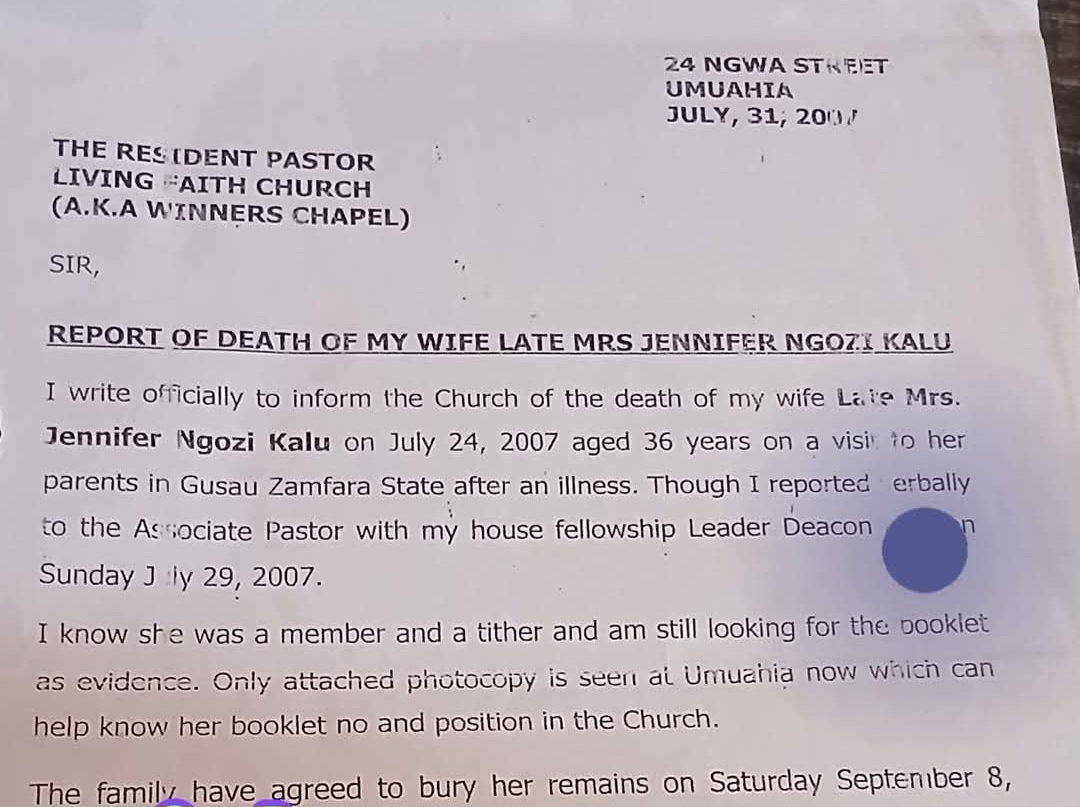 The letter shows the widower informing the church of his 36-year-old wife’s de@th while inviting them to bury his wife.