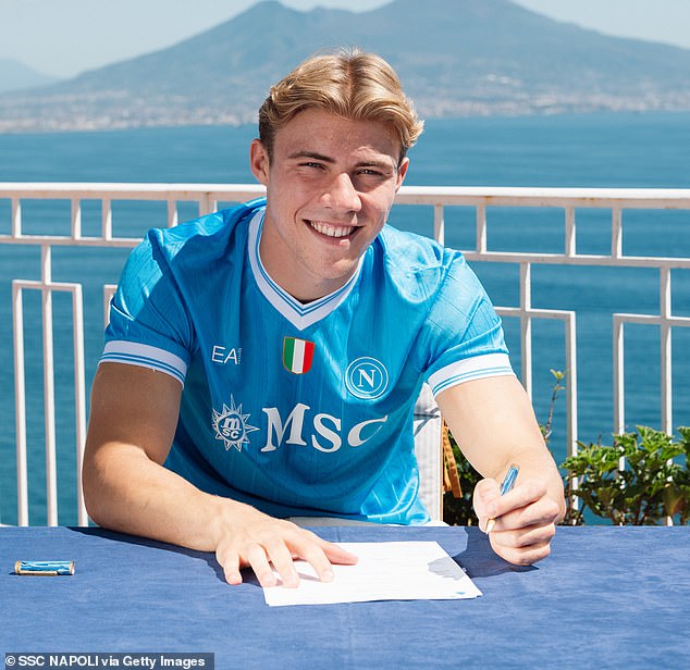 Napoli’s announcement read: ‘SSC Napoli announces that it has acquired the sporting services of footballer Rasmus Hojlund from Manchester United Football Club on loan with an obligation to buy.