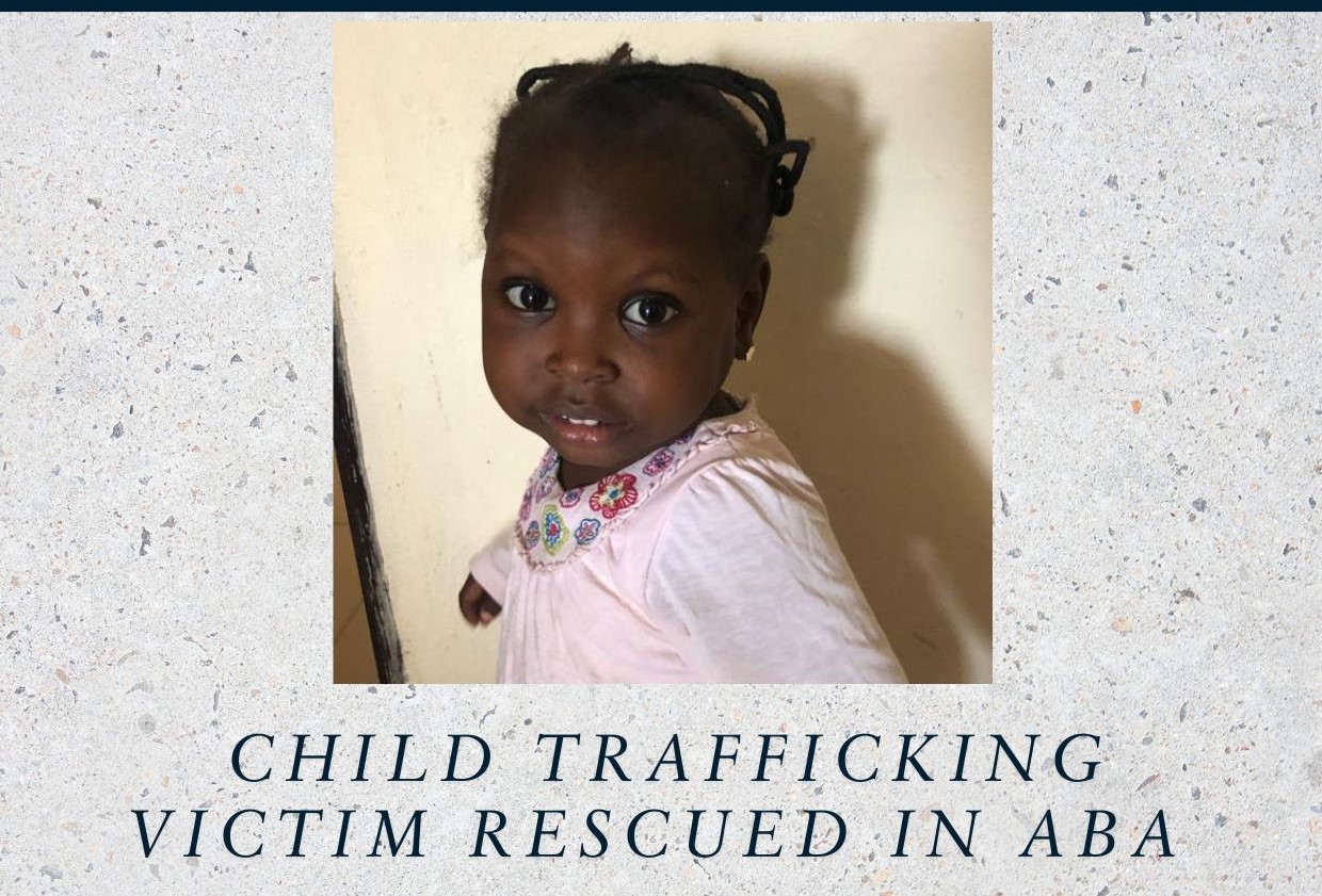 A 2-year-old girl, renamed Chiamaka Favor (alias), who was trafficked from Abuja to Aba in February 2025, has been rescued by National Agency for the Prohibition of Trafficking in Persons (NAPTIP).