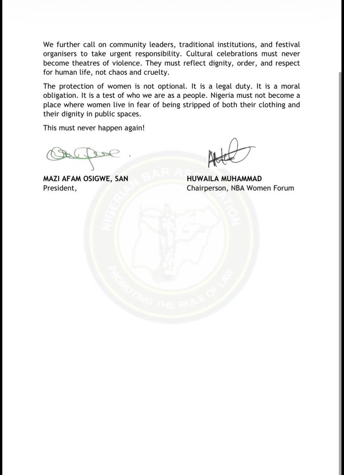 The Nigerian Bar Association (NBA) has condemned the sxual ass@ult on a group of women during a local festival in the Ozoro area of Delta, describing it as a national disgrace. Viral videos circulating on social media had shown some men sxually harassing young females for daring to come out during the festival. It was gathered that the events occurred during the Alue-Do Festival in Uruamudhu Community, one of the five traditional communities that make up Ozoro Kingdom. In a statement on Saturday and jointly signed by NBA President Afam Osigwe and Chairperson of the NBA Womens Forum, Huwaila Muhammad, the association described the episode as a national disgrace and a collapse of conscience and a violation of human rights. A society reveals its true character in how it treats its women. Where women are chased, stripped, groped, violated, and publicly humiliated by mobs under the guise of celebration, what is on display is not culture. It is barbarity. It is a collapse of conscience. It is a stain on our shared humanity. The deeply disturbing reports emerging from a recent festival in Ozoro, Delta State, are not just troubling; they are horrifying. Women were allegedly accosted in broad daylight, forcefully stripped of their clothing, sexually assaulted, and subjected to degrading treatment by groups of young men while others watched, recorded, and, in some instances, cheered. No woman should ever have to endure such terror, such exposure, such violation of her dignity. This was not a festival. This was lawlessness. This was gender-based violence in its most primitive and shameful form. These acts amount to a grave violation of the fundamental rights to dignity of the human person, personal liberty, and security as guaranteed under the Constitution of the Federal Republic of Nigeria, 1999 (as amended), as well as other international human rights instruments. They also constitute serious criminal offences under our laws, including assault, sexual violence, and public indecency. The NBA condemns these acts in the strongest possible terms. No tradition, no custom, no so-called cultural practice can excuse or legitimise the degradation and violation of women. Any practice that permits such cruelty is not culture. It is criminality. We call on the Delta State Government and all relevant law enforcement agencies to act swiftly and decisively. The perpetrators must be identified, arrested, and prosecuted. Those who aided, enabled, or failed to intervene must also be held accountable. Justice must not be delayed, and it must not be selective. Silence, indifference, or excuses in the face of such brutality only embolden further abuse. We further call on community leaders, traditional institutions, and festival organisers to take urgent responsibility. Cultural celebrations must never become theatres of violence. They must reflect dignity, order, and respect for human life, not chaos and cruelty. The protection of women is not optional. It is a legal duty. It is a moral obligation. It is a test of who we are as a people. Nigeria must not become a place where women live in fear of being stripped of both their clothing and their dignity in public spaces. This must never happen again! Meanwhile, the Nigeria Police Force has confirmed the arrest of a community leader and several suspects in connection with the incident, adding that a full-scale investigation is underway and assuring that all those involved will be brought to justice. The post NBA condemns sxual ass@ult on women at Delta Festival appeared first on Linda Ikeji Blog.