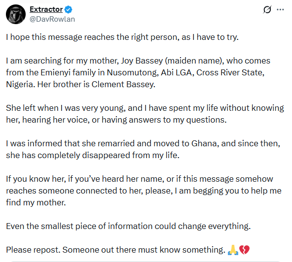 If you know her, if you’ve heard her name, or if this message somehow reaches someone connected to her, please, I am begging you to help me find my mother.