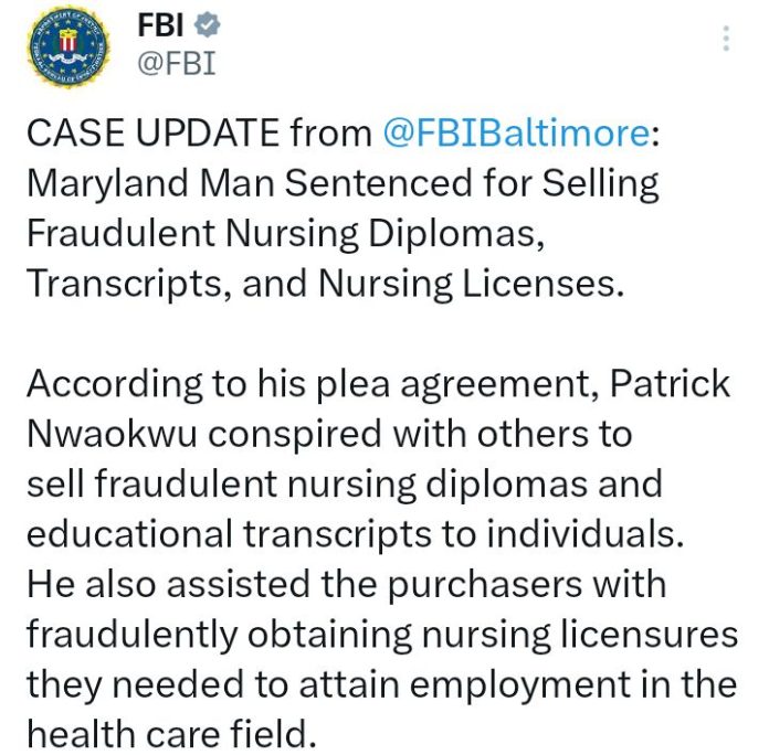 A 55-year-old Nigerian man, Patrick Nwaokwu, was sentenced in connection with a nursing credentials scam in the United States.