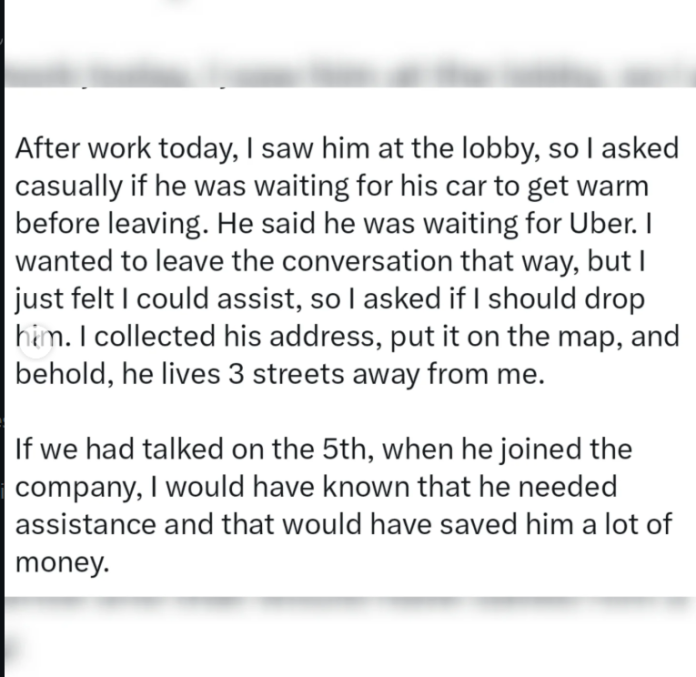 Later that day, the user saw him again in the lobby and casually asked if he was waiting for his car. The colleague said he was waiting for an Uber. Although he initially planned to end the conversation there, he decided to offer help and asked if he could give him a lift.