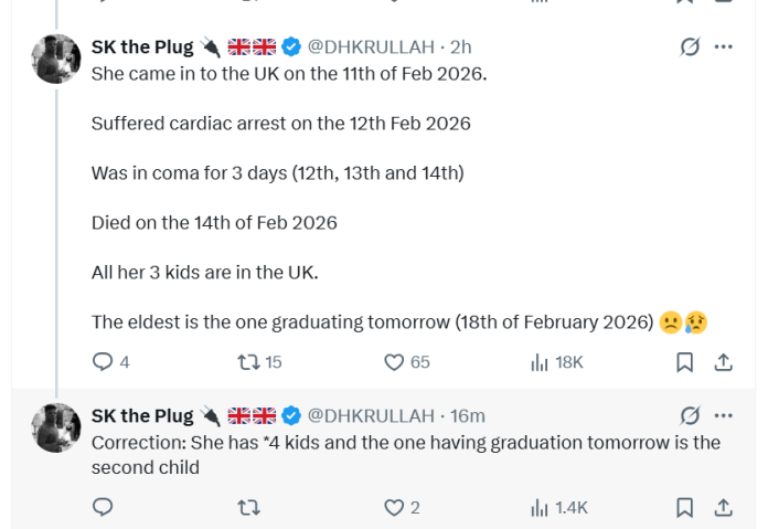 According to the post, she travelled to the UK on February 11, 2026, ahead of her child’s graduation scheduled for February 18. However, in the early hours of February 12, she reportedly suffered a sudden cardiac arrest and was rushed to Luton and Dunstable Hospital.
