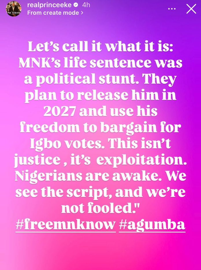 In a post shared on IG, Eke opined that the Nigerian political class plan to release him in 2027 and use his freedom to bargain for votes from the Igbos.