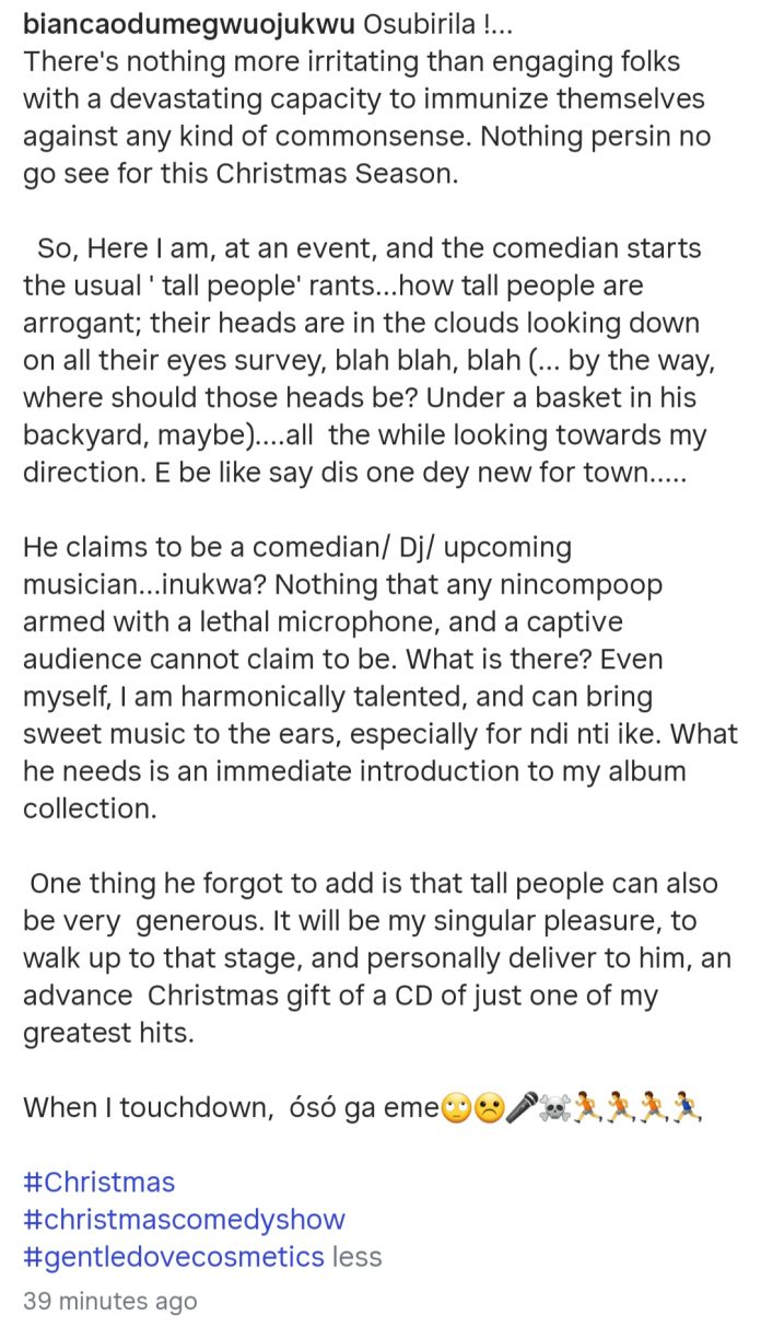 Bianca Ojukwu wrote: “There’s nothing more irritating than engaging folks with a devastating capacity to immunize themselves against any kind of commonsense. Nothing persin no go see for this Christmas Season.