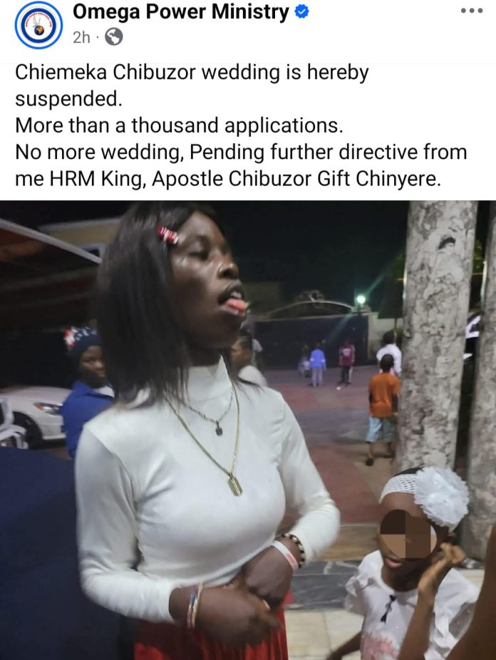 “Chiemeka Chibuzor wedding is hereby suspended,” OPM announced on Facebook. “More than a thousand applications. No more wedding, Pending further directive from me HRM King, Apostle Chibuzor Gift Chinyere.”