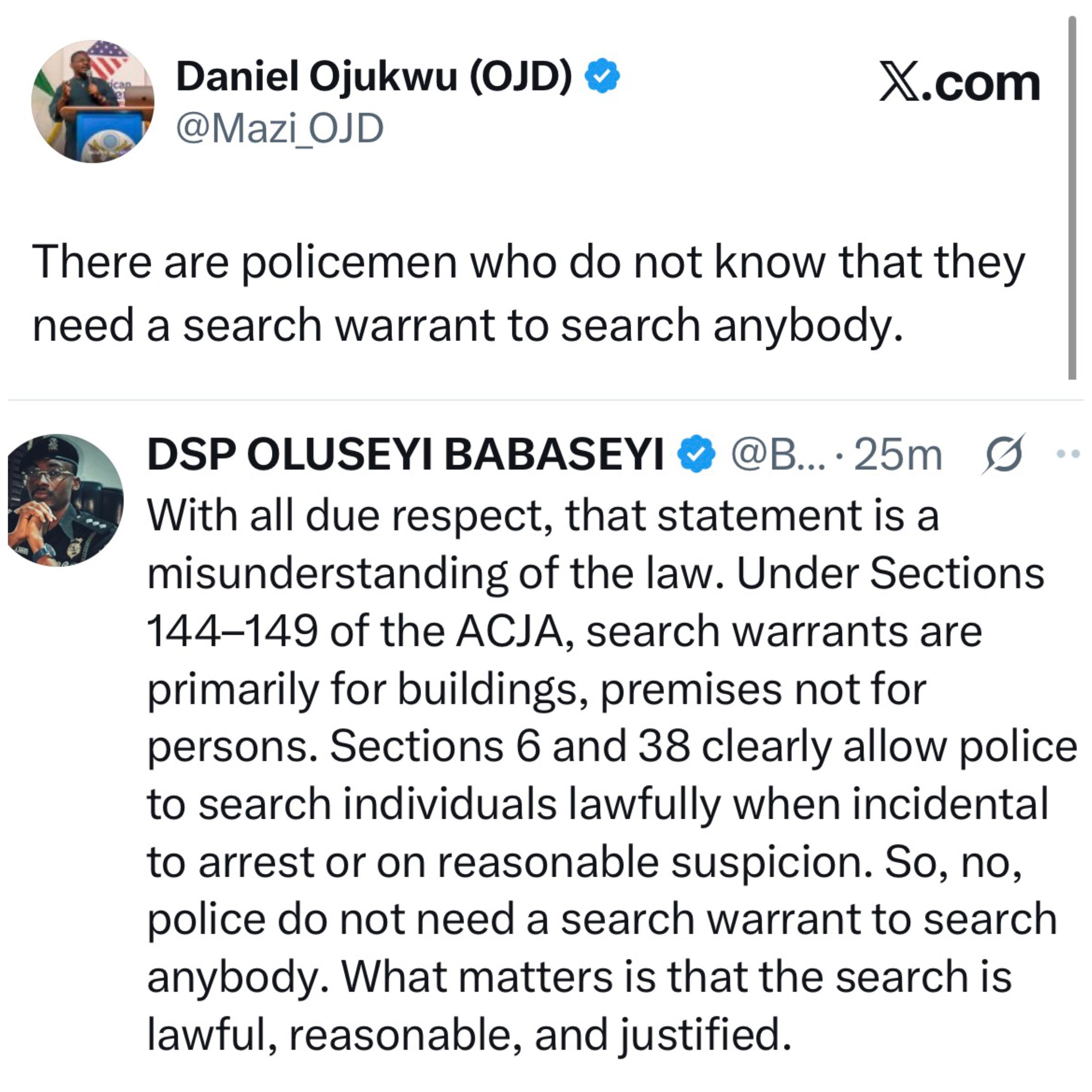 The spokesperson of the Ogun state police command, DSP Oluseyi Babaseyi, has said that the police does not require a warrant before they can search anyone in Nigeria. In a post shared on X, Babaseyi stated that the constitution permits the police to carry out a search on a person without a warrant but that a warrant is required when a search is to be conducted in a buildings or premises.