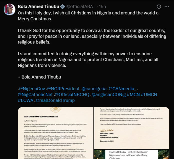 Bola Ahmed Tinubu has extended Christmas greetings to Christians in Nigeria and across the world, while reaffirming his commitment to religious freedom and peaceful coexistence in the country.