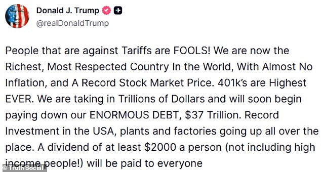 “People that are against Tariffs are FOOLS!” Trump wrote. “We are now the Richest, Most Respected Country In the World, With Almost No Inflation, and A Record Stock Market Price. 401k’s are Highest EVER. We are taking in Trillions of Dollars and will soon begin paying down our ENORMOUS DEBT, $37 Trillion. Record Investment in the USA, plants and factories going up all over the place. A dividend of at least $2000 a person (not including high income people!) will be paid to everyone.”