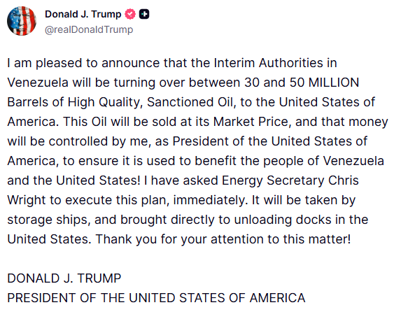 Trump wrote, “I am pleased to announce that the Interim Authorities in Venezuela will be turning over between 30 and 50 MILLION Barrels of high-quality, sanctioned oil to the United States of America.