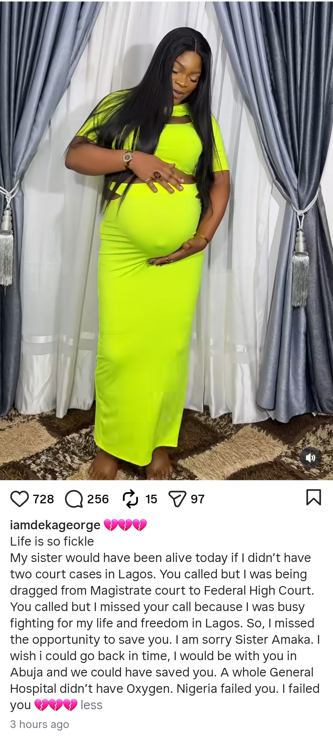 A content creator has blamed the Nigerian healthcare system for her sister’s de@th. Deka George, who had a protracted legal battle after calling out a hair vendor over an unsatisfactory business transaction, also believes the legal struggles she faced for giving a bad review to the vendor played a part in her sister, Amaka’s de@th. Deka’s sister, Amaka, did at the age of 36. Sharing photos and a video from Amaka’s maternity photoshoot, Deka wrote: “Life is so fickle. My sister would have been alive today if I didnt have two court cases in Lagos. You called but I was being dragged from Magistrate court to Federal High Court. “You called but I missed your call because I was busy fighting for my life and freedom in Lagos. So, I missed the opportunity to save you. I am sorry Sister Amaka. I wish i could go back in time, I would be with you in Abuja and we could have saved you. “A whole General Hospital didnt have Oxygen. Nigeria failed you. I failed you.”