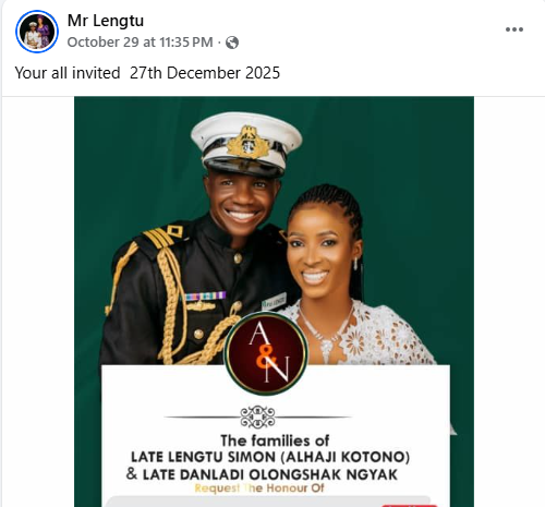 A Nigerian man, Abednego Simon (Mr Lengtu) has been lleft heartbroken after his fianc d!ed a month to their wedding. Abednego and Naomi Danladi’s wedding was scheduled to hold on December 27, 2025 in Mangu Local Government Area of Plateau State. The circumstances surrounding Naomi’s sudden d3ath are still sketchy at the time of filing this report. One Kontyos Kefas John, who confirmed the sad development on Tuesday, November 25 said Naomi d!ed in an accident.” However, the grief-stricken groom, who had earlier shared their wedding invite, alleged that some people k!lled his fianc. They invite you because they have their plans on you, they k!!ll you for me. They have said that our marriage will not work, and they succeeded. God arise !! Her soul will never rest until she gets justice. God arise and stand for her. That your uncle that live in Abuja, that invite you to kagu. It shall not be well with him. No sickness nothing, nothing, just like that?, he wrote in a Facebook post on Tuesday.