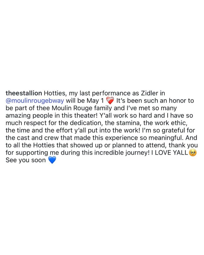 “Hotties, my last performance as Zidler in @moulinrougebway will be May 1 ❤️🩹,” she shared on Instagram. “It’s been such an honor to be part of thee Moulin Rouge family and I’ve met so many amazing people in this theater!”
