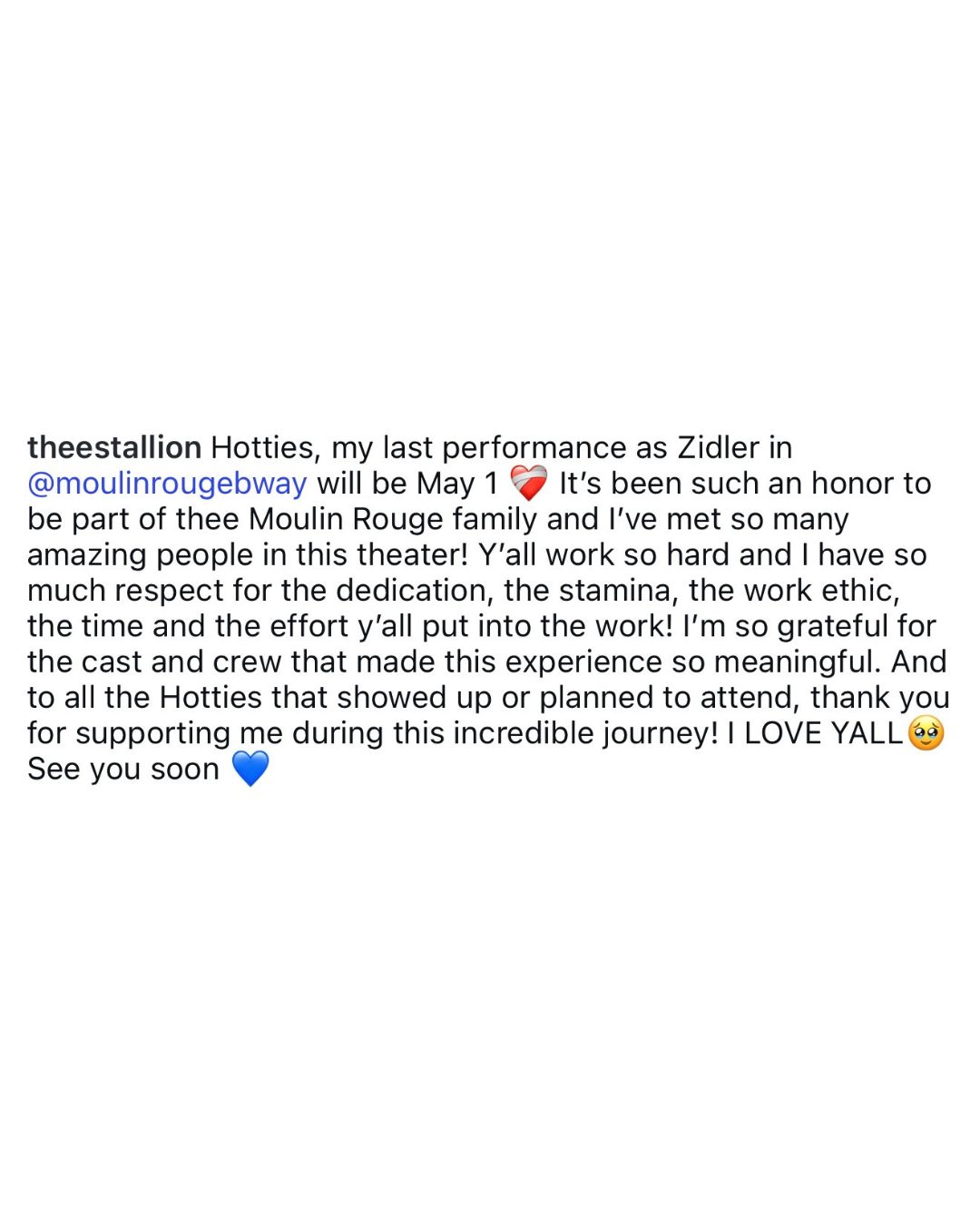 Megan Thee Stallion has announced her early exit from “Moulin Rouge! The Musical” following her nasty split from NBA star Klay Thompson.