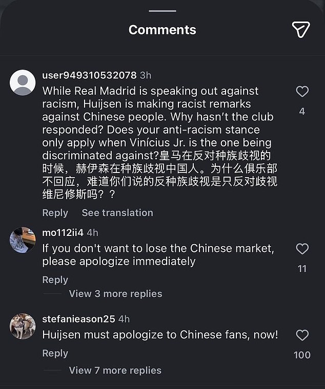 Other users flocked to the comments to demand the apology, with one posting: ‘While Real Madrid is speaking out against racism, Huijsen is making racist remarks against Chinese people. Why hasn’t the club responded?
