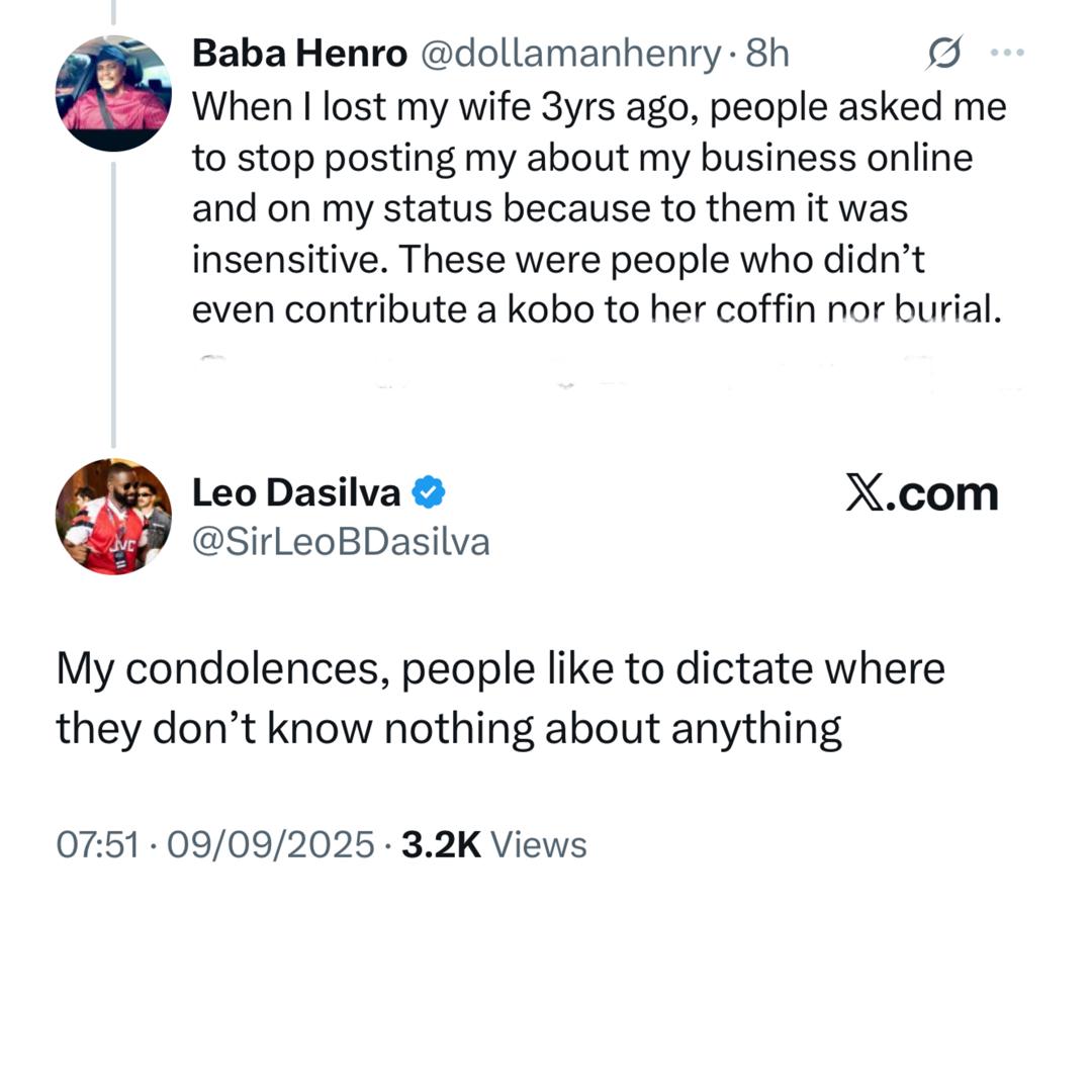 In a post shared on X, Leo stated that a content creator who does his contents with his wife recently lost her and some people are insulting him for posting contents online just after losing her. Leo questioned the moral grounds people have to tell anyone what to do when they lose a loved one.